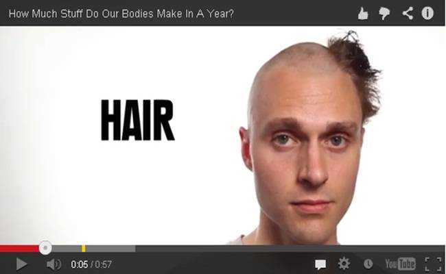 Corpo humano – O que produz durante um ano: Esse vídeo irá amostrar quase tudo das coisas que acontece com o corpo humano durante exatamente um ano, cabelos, unhas, pele, lágrimas, suor, saliva, urina e fezes tudo isso se fossemos acumular durante um ano.