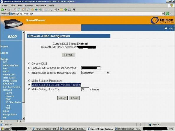 Você pode também desativar o Firewall do modem e instalar um firewall na sua máquina.